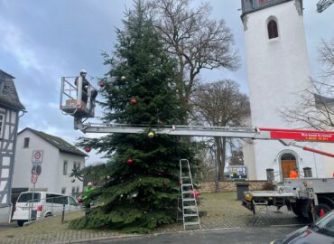 In Mensfelden erscheint eine Kugel mit dem Logo zum Dorfjubiläum – farbenfroher Blickfang und Erinnerung an die Festveranstaltungen.