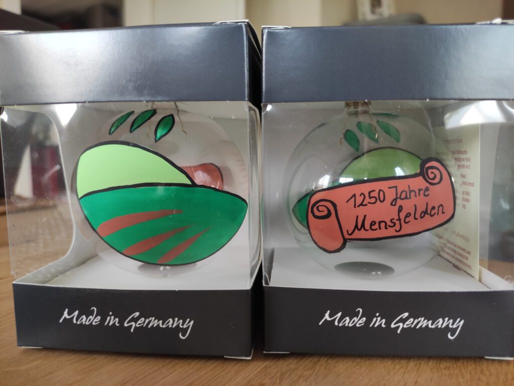 In Mensfelden erscheint eine Kugel mit dem Logo zum Dorfjubiläum – farbenfroher Blickfang und Erinnerung an die Festveranstaltungen.